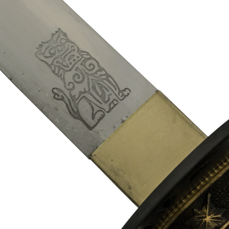 - Blade features engraving while pommel, scabbard and sword guard features golden, brass-colored engravings
