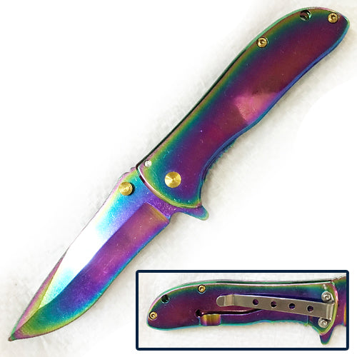 This knife has a shiny sharp blade, made with durable steel. It has a solid finish Rainbow color grip to handle for hand-to-hand combat. Thumb stud functionality gives access to take immediate action in an emergency situation. Attach this lightweight knife to your belt or pocket and easily carry it on your person.